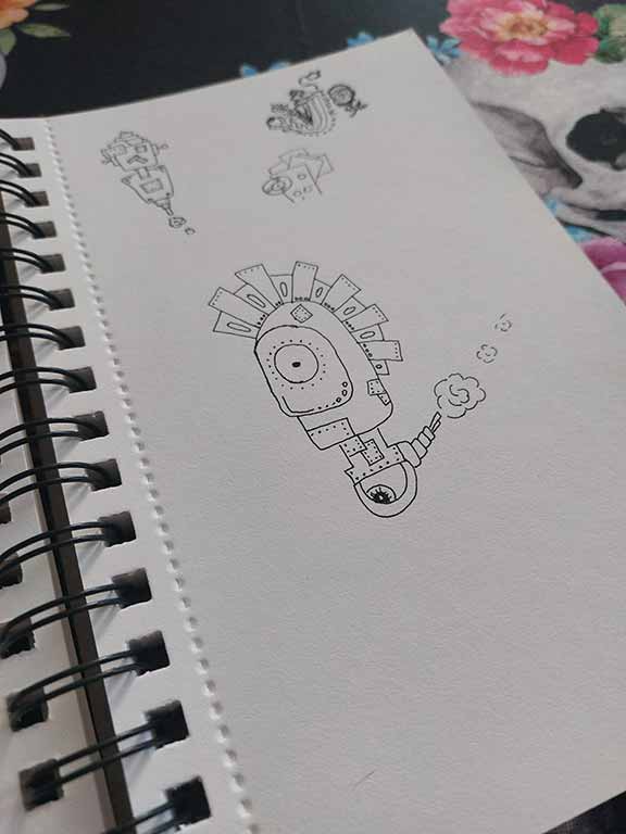My getting back in point. One sketchbook, multiple doodles, no order, all chaos. If you suffer from blank page-itis, this idea might work for you too.